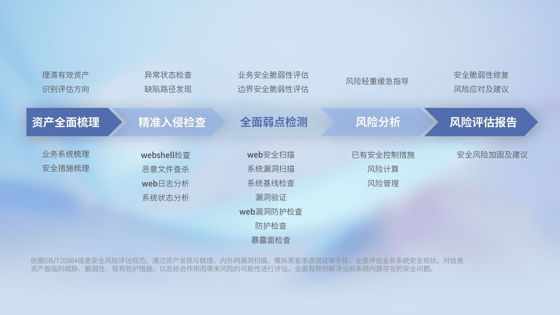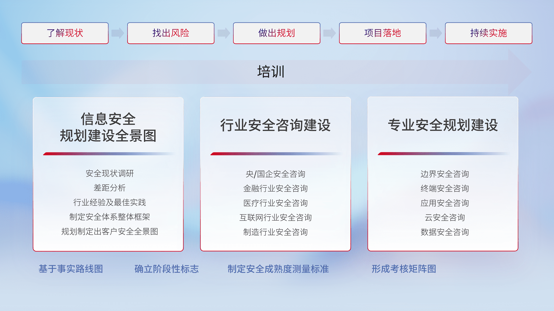 针对客户行业特性,,以专业的安全服务+多厂商联合解决方案提供专属的一站式安全管理服务,,,,帮助客户全面感知网络空间威胁,,,,基于识别、、检测、、、分析、、防护、、监测、、、、响应的服务理论模型,,,,从方案咨询、、、、集成交付、、评估验证、、、、优化加固、、运维运营,,致力于为客户提供完整的闭环管理式安全服务。。。以实战经验为客户打造高抵御风险的安全体系,,,帮助客户发现威胁、、、、对抗威胁、、、、处置威胁,,,不断积累安全对抗能力,,,,持续保障数字化安全。。。。